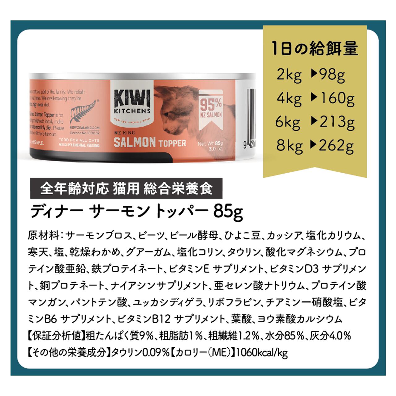 【保証分析値】粗たんぱく質9%、粗脂肪1%、粗繊維1.2%、水分85%、灰分4.0%